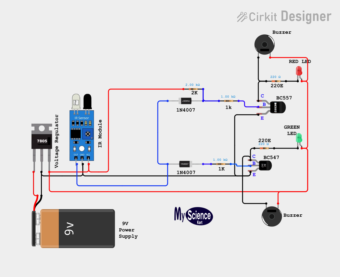 - ట్రాన్సిస్టర్ → LED + బజ్జర్